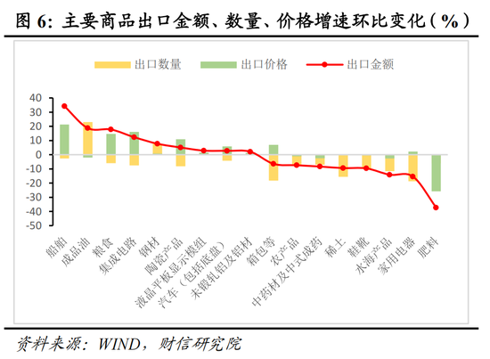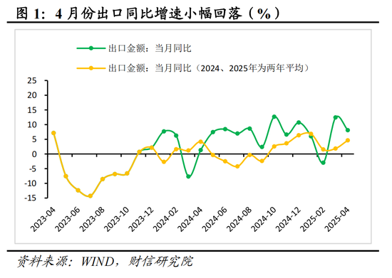 正文 事件:据海关统计,2025年4月份全国进出口总额5352.0亿美元,同比增长4.6%,较3月份回落0.4个百分点。其中,出口3156.9亿美元,同比增长8.1%,较3月份回落4.3个百分点;进口2195.1亿美元,同比下降0.2%,较3月份回升4.1个百分点;贸易差额961.8美元,较3月份减少64.6亿美元。 一、美国关税冲击和高基数共同拖累出口增速,但程度暂时低于预期 去年同期出口增速较前值回升9.0个百分点(见图1),大幅走高,是今年4月份出口增速回落的原因之一。从环比增速看,4月出口环比增速低于历史同期均值2.1个百分点,(见图2),说明还存在其他因素拖累出口增速。 分国家和地区看,在美国高额关税冲击下,4月份我国对美国出口同比下降21.0%,增速较3月份大幅回落30.1个百分点(见图3),拖累出口增速3.0个百分点。但4月份出口仍然保持较高正增长,超出市场预期,主要在于美国对不采取报复行为的国家实施了为期90天的关税暂停,在此期间仅征收10%的对等关税,这在一定程度上促使我国对其他地区转口贸易加速。如4月份对东盟、加拿大等地区出口分别增长20.8%、15.0%,较3月份分别回升9.3、2.1个百分点(见图3)。 分产品看,4月份机电产品出口同比增长10.1%,较3月份回落3.3个百分点(见图4),贡献了出口增速回落幅度的五成左右。分重点商品看,除陶瓷产品以外的劳动密集型产品以及大部分化工与贱金属产品出口增速均较上月下降,对本月出口增速形成拖累(见图5)。 从出口数量和价格看,出口数量增速和价格增速环比回落的品种分别为13种和6种,且数量增速回落幅度更大一些(见图6),说明数量因素是出口同比回落的主要拖累。 二、数量因素支撑进口增速小幅回升 去年同期进口增速较前值大幅回升10.3个百分点(见图7),去年基数大幅走高,表明基数效应不能解释4月份进口增速的回升。从进口量和价看,11种商品进口数量增速回升,8种商品进口价格增速环比下降,说明数量因素是进口增速回升主因。分产品看,农产品、大豆、粮食、铁矿砂、肥料、铜矿砂等商品进口数量增速出现回升,这一现象或与两方面因素有关:一是美国加征关税压力促使我国出于粮食安全战略考虑,加大了对大豆、农产品等关键物资的进口力度;另一方面也反映出国内需求在温和恢复(见图8)。预计随着国内政策聚焦于扩内需等重点领域集中发力,未来内需逐渐回暖有望对进口增速形成支撑。 三、预计关税冲击将导致出口增速下降7~11%,2025年全年出口增速约为0% 往后看,关税和价格因素或将对出口增速形成拖累,但我国出口仍具有利条件。一是美国关税政策将对全球贸易复苏带来冲击,且其朝令夕改、反复无常的关税政策也加剧了全球贸易更加碎片化的风险。二是中美双边加征关税幅度超过100%,这在很大程度上意味着短期内双边贸易已基本脱钩,将对我国出口产生显著冲击。三是原油价格受供应过剩影响面临下行风险,加上国内部分行业受出口下行影响,产能过剩压力或有所增加,PPI负增趋势难改,将对出口增速形成拖累。四是近年来我国贸易伙伴不断拓展、贸易结构持续优化,有效提高了我国应对全球供应链和市场波动的能力,或对出口份额形成一定支撑。 预计关税冲击将导致出口增速下降7~11%,2025年出口增速约为0%。根据WTO发布的《2025年世界贸易展望》预测,本次美国对等关税将导致美对中进口增速下降约77%,在此情形下,若不考虑任何转口贸易,预计本轮关税冲击将导致我国出口增速下降约11%。但鉴于全球产业链的深度重构需要时间缓冲,美国国内需求在一定程度上仍需依赖进口来满足,中国通过第三国转口贸易尚存较大回旋余地。因此,若考虑转口贸易因素,预计本轮关税冲击将导致我国出口增速下降约7%,但考虑1-4月出口累计增长6.4%,全年出口增速或在0%左右。 四:总结:4月份出口增速小幅回落、进口增速回升。出口增速回落主要源于当月关税冲击显效,对美出口大幅下降,同时高基数产生下拉作用。但当月出口仍然保持较高正增长,预计转口贸易加速发挥了重要作用。进口增速小幅回升,一方面或与我国对大豆、农产品等有关粮食安全的关键物资进口力度加大有关,另一方面源于国内需求持续恢复进口数量增速的回升。往后看,关税政策对我国出口的影响将进一步显现,国际大宗商品价格下降也会对出口增速形成拖累;但我国贸易伙伴多元化和贸易结构优化,能缓冲部分影响;预计本轮关税冲击将影响出口增速下降7%左右,考虑今年1-4月出口累计增长6.4%,2025年全年出口增速约为0%。